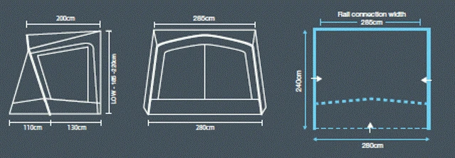 The Outdoor Revolution Sportline Canopi Lowline fit vans between 180-220cm in height. It will fit on VW Transporters, T4, T5, T6, Mazda Bongo, Van conversion, motorhomes and more. If you have any question how to fit this to your van or if it will fit please feel free to give us a call or send us a e mail, and we will be pleased to help.